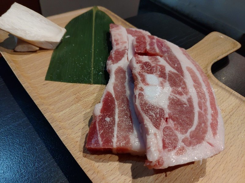 點完餐以後快速地送上了韓式小菜和沾醬,小菜可以續,有生蒜辣椒、醃蘿蔔、醃洋蔥、泡菜和豆芽菜,還有包肉的生菜。